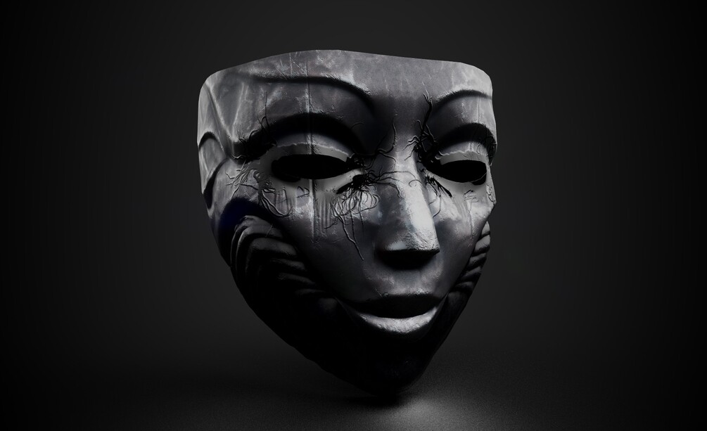 - Metallic mask with black liquid running out of eyes